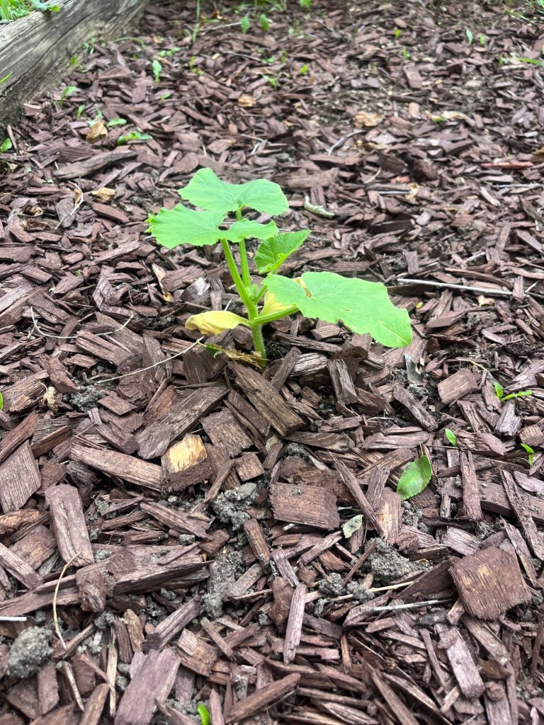 For my next step, I planted a pumpkin which I started from seed in early May of this year. This plant was healthy but smaller than most of my other pumpkin plants. I used this plant as a sort of “trial run” to test certain factors within the planter box. Using this plant, I will be able to look for pest problems that may occur within the box. Additionally, I can test whether the sun exposure (which is mostly east to west due to trees on the north and south) is sufficient for the pumpkins I will be planting. Finally, I can use this “trial run” to make sure the sprinkler and the afternoon showers provide enough water for the plant. I will observe this plant for a couple days, and if the factors are satisfactory, I will begin moving more pumpkin plants in, as well as other types of plants! The plant in the garden box is shown below: